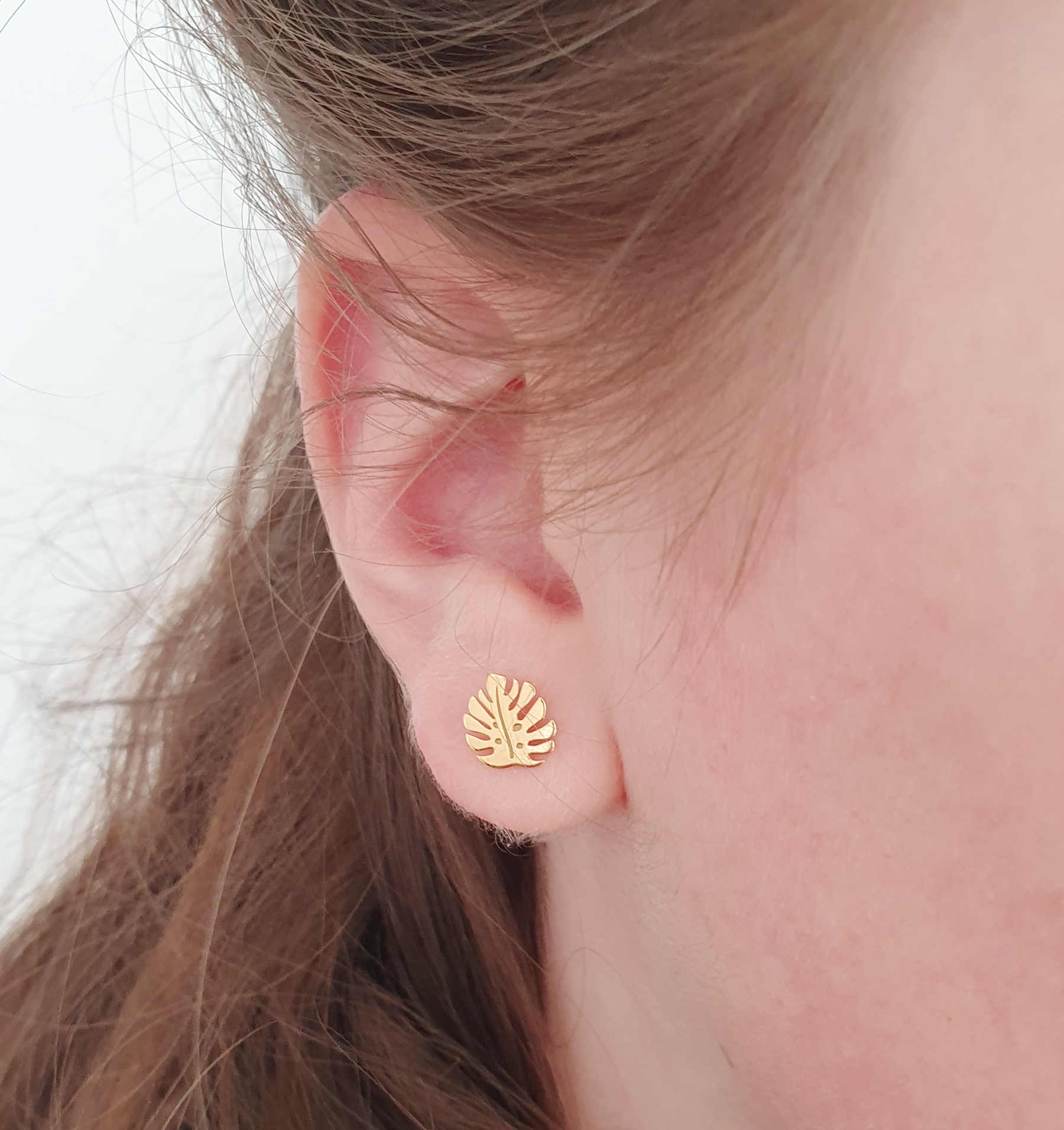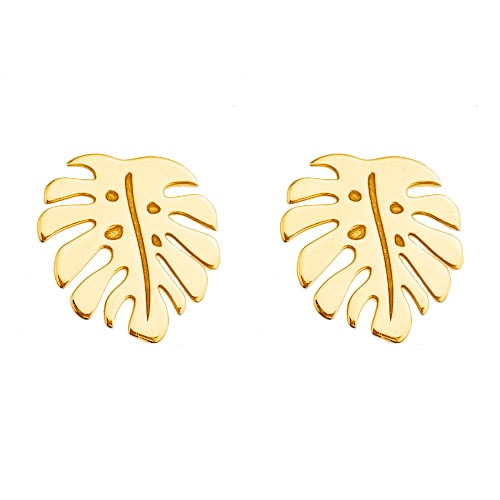 Feine, zarte und verspielte Monstera-Ohrstecker aus 925 Silber vergoldet.