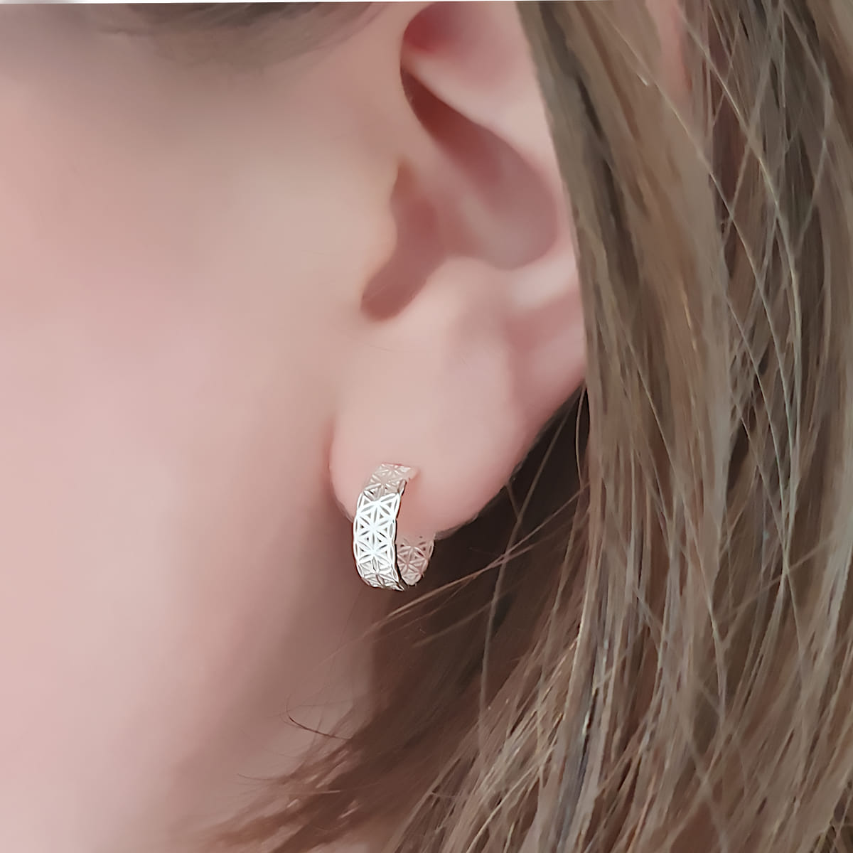 Ein Paar schlichte Creolen aus 952 Silber, geziert von einem Blume des Lebens Design.
