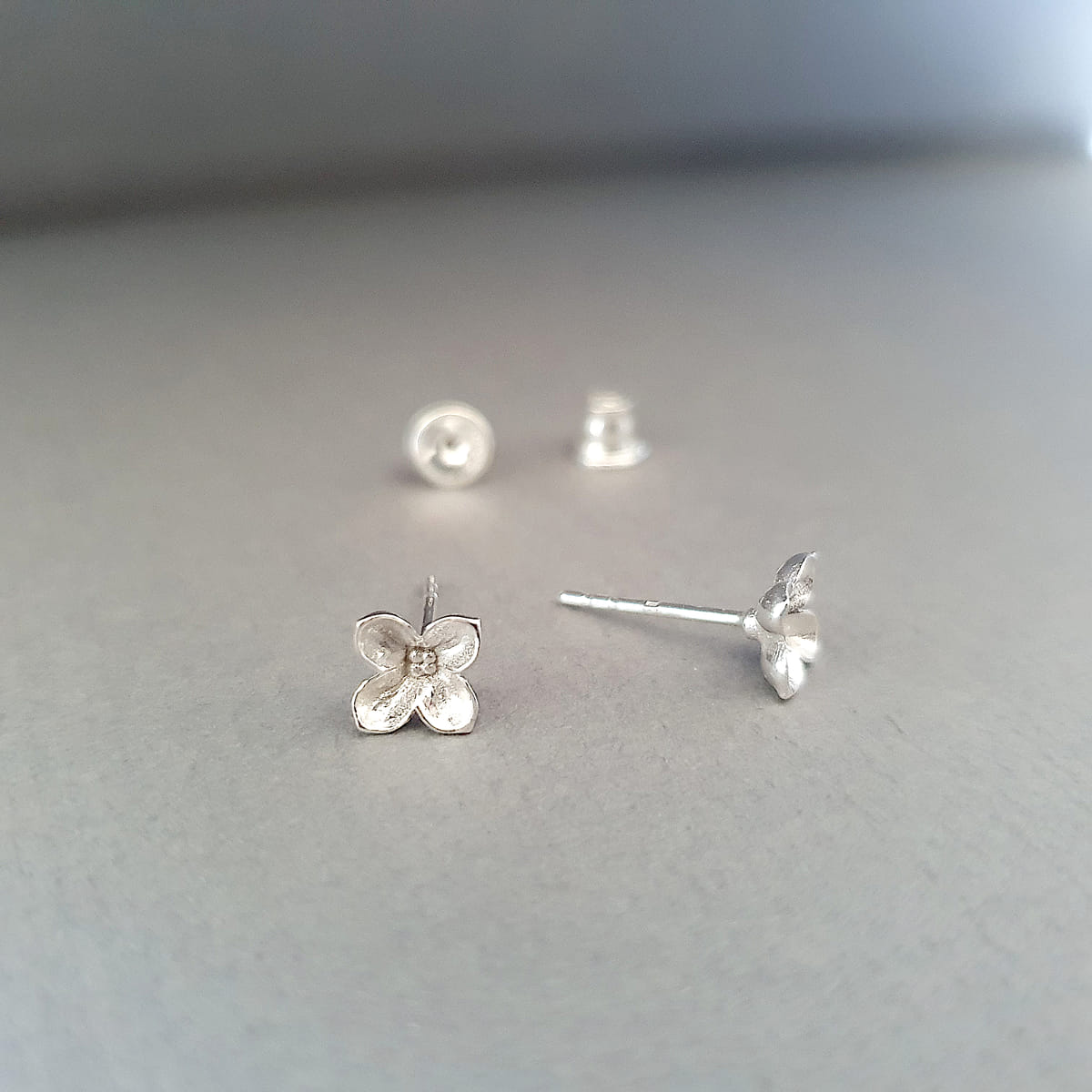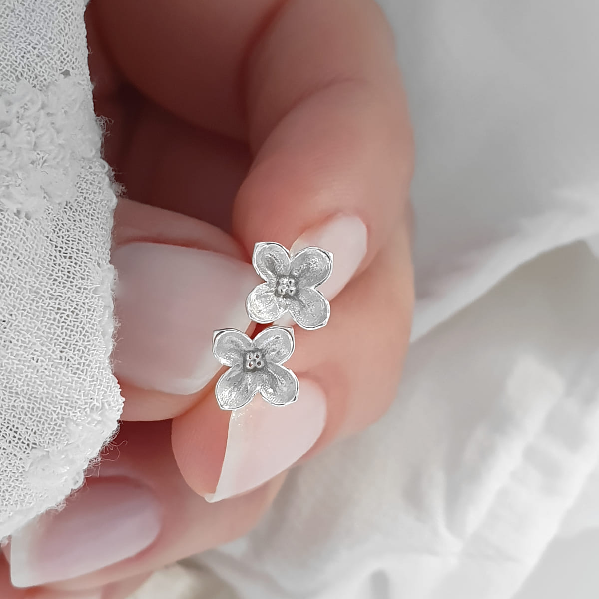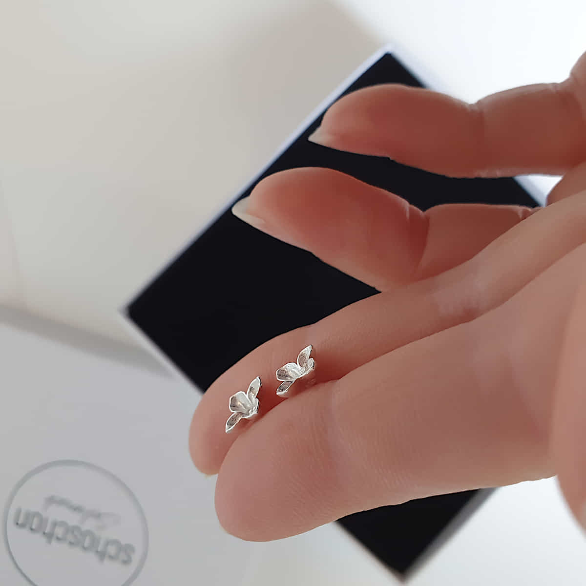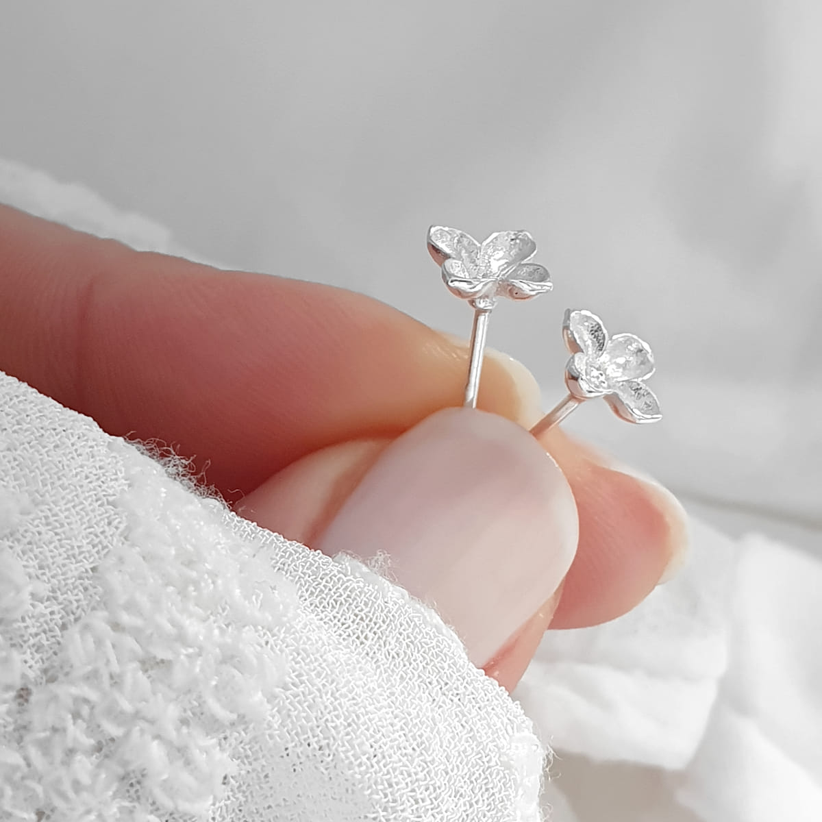 Zwei kleine (Größe 8 x 8 mm), entzückende Ohrstecker, wie zierliche Kunstwerke mit winzigen Blüten geschmückt, sind so kunstvoll gestaltet, dass sie beinahe wie echte Blütenblätter wirken.