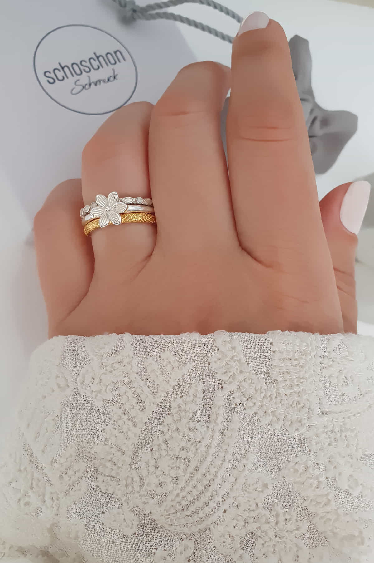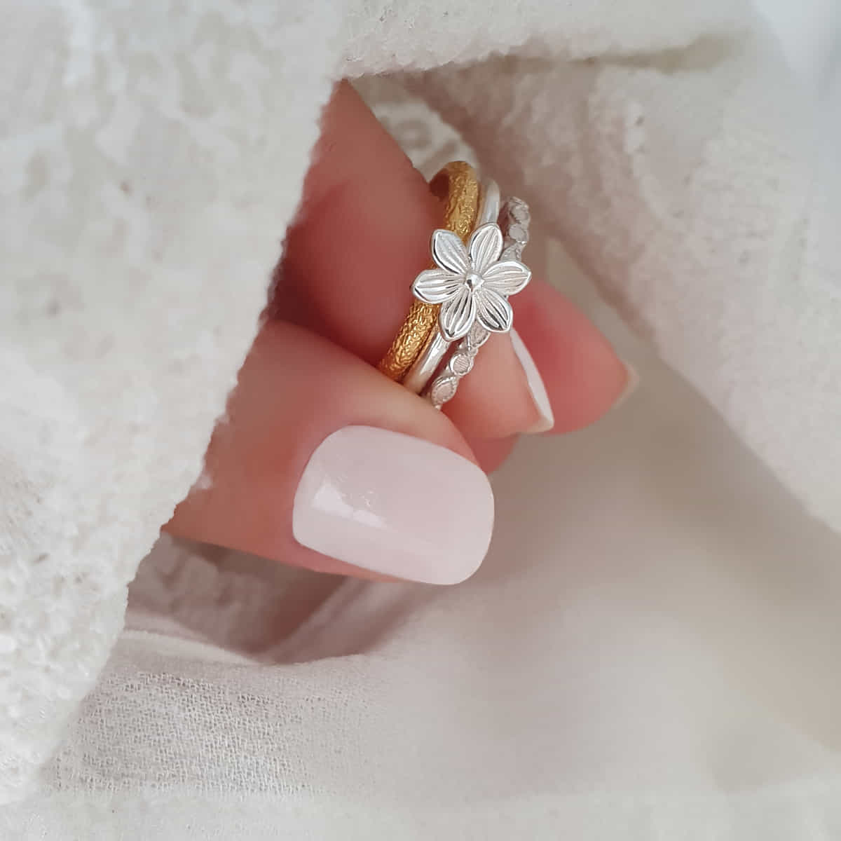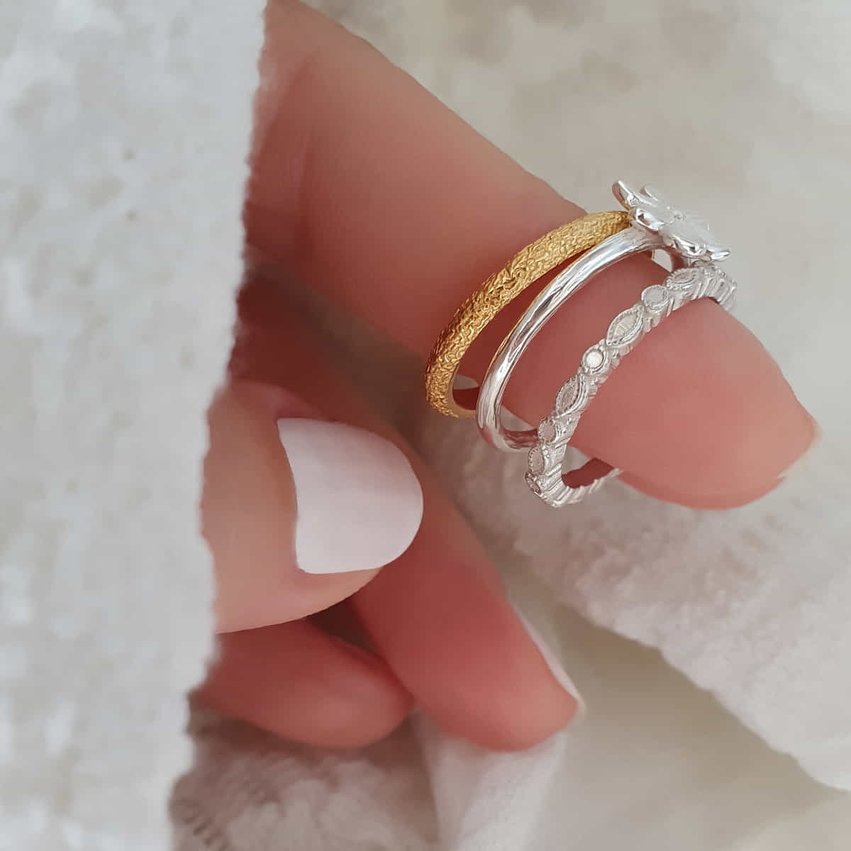 Drei Ringe, unzählige Looks – ein vergoldeter Glanz, eine zarte Blüte und moderne Struktur. Zusammen ein Statement, einzeln dein persönlicher Stil.