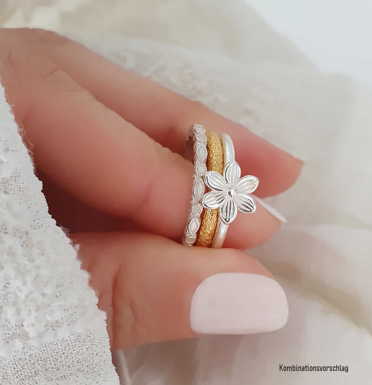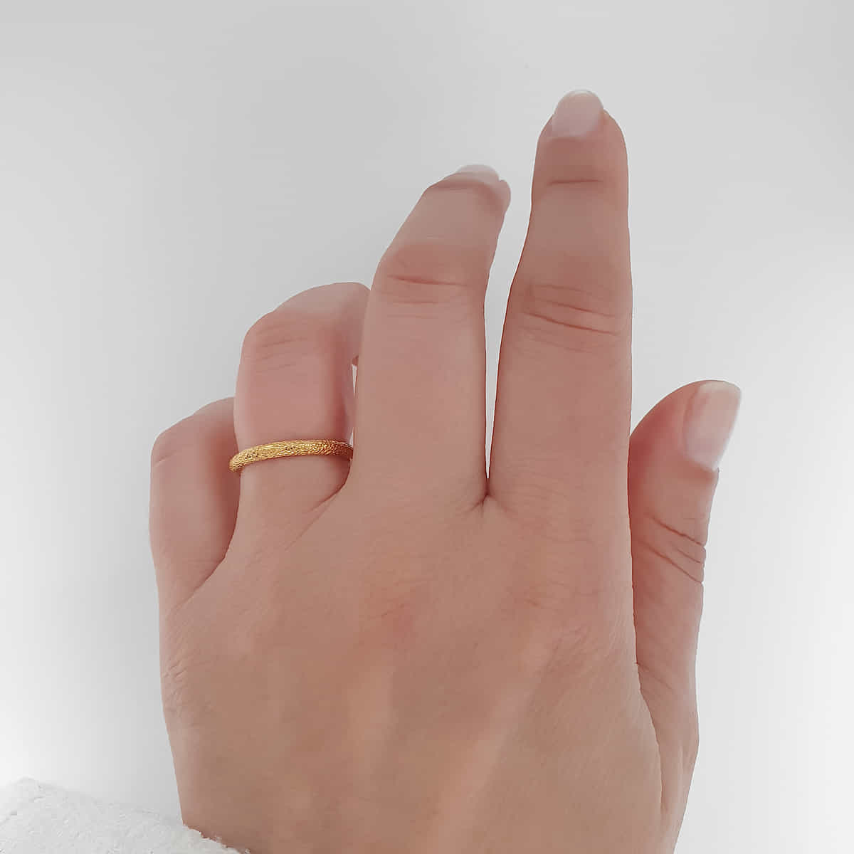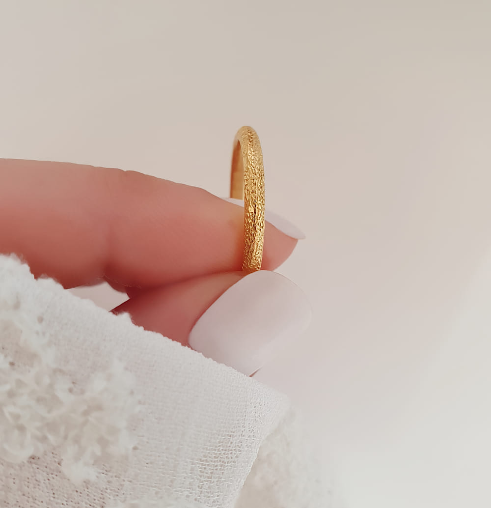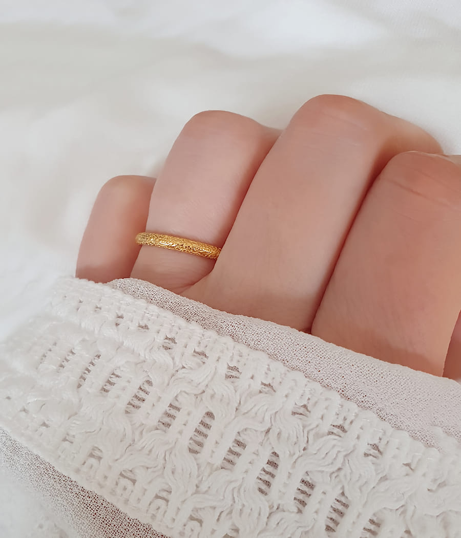 Zwei oder mehrere Ringe lassen sich hervorragend miteinander kombinieren und sorgen für ein elegantes Zusammenspiel. Die zarten, feinen glänzenden unregelmäßigen Strukturen wechseln sich harmonisch mit matten Vertiefungen ab und verleihen den Ringen eine stilvolle, organische Struktur. Dieses außergewöhnliche Damenfreundschaftsring-Design wirkt am Finger wunderbar dezent und elegant, ein echter Hingucker für jeden Anlass.
