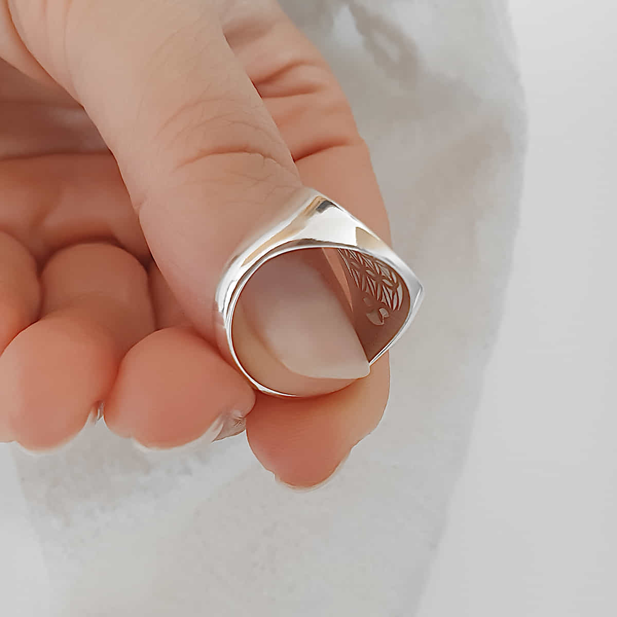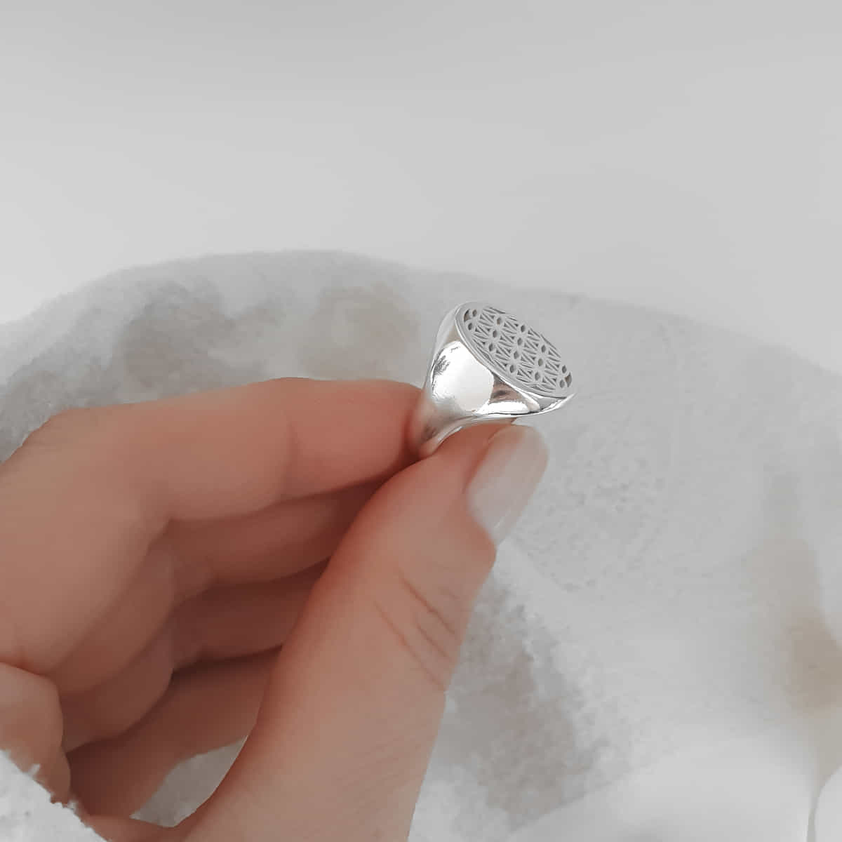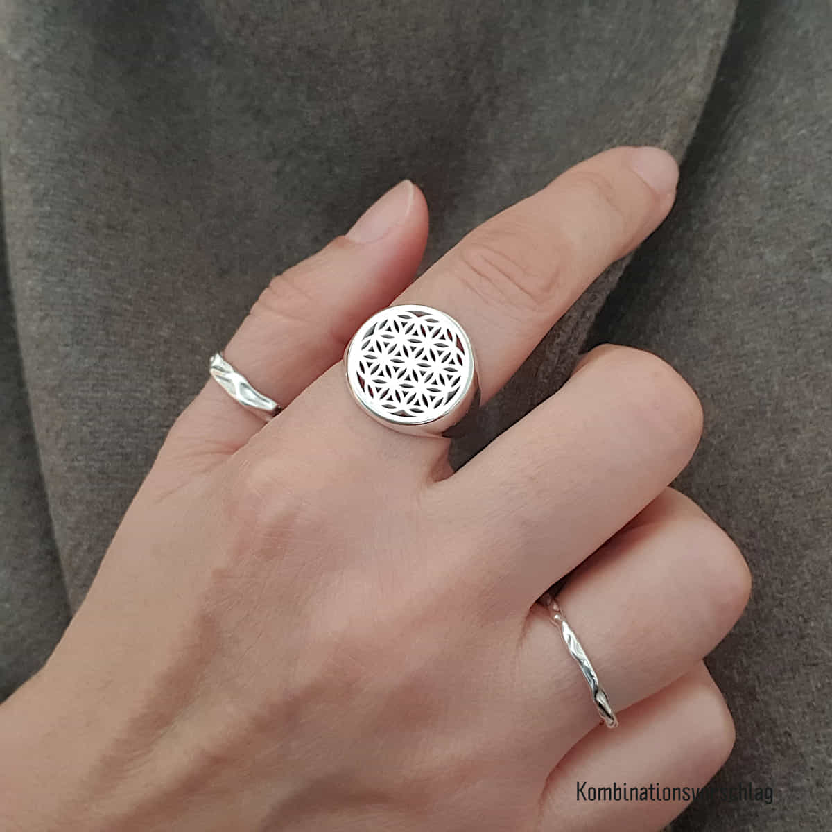 Dieser Damenring aus 925er Silber besticht durch sein detailreiches Design: Die filigran eingearbeitete Lebensblume verleiht dem Schmuckstück eine besondere Symbolik und zeitlose Eleganz.