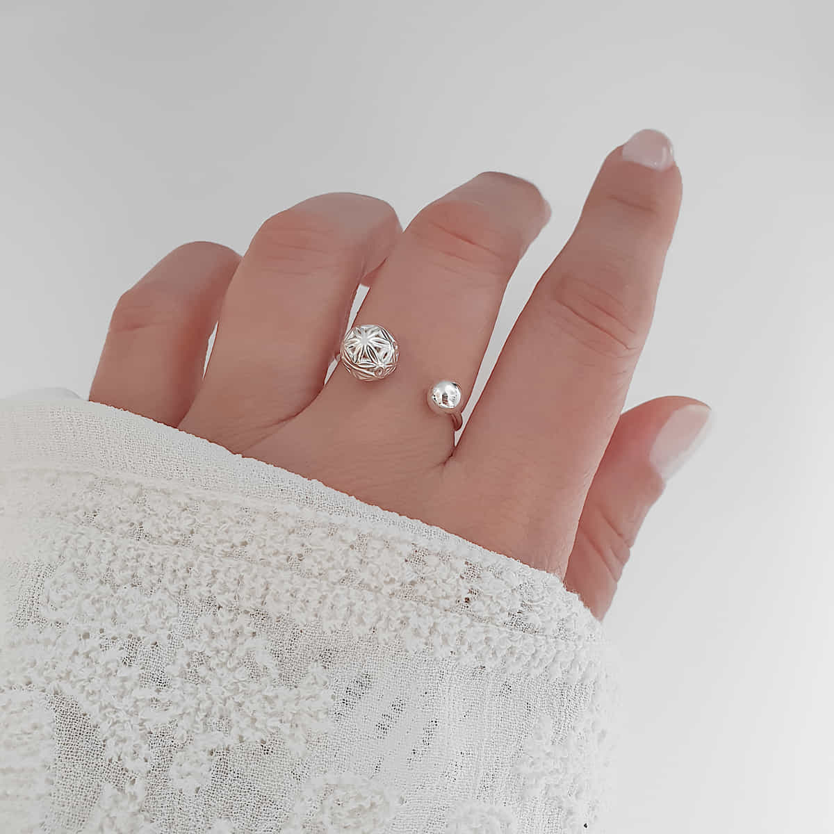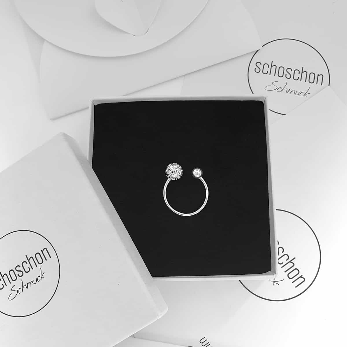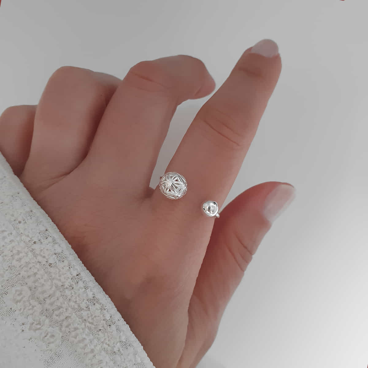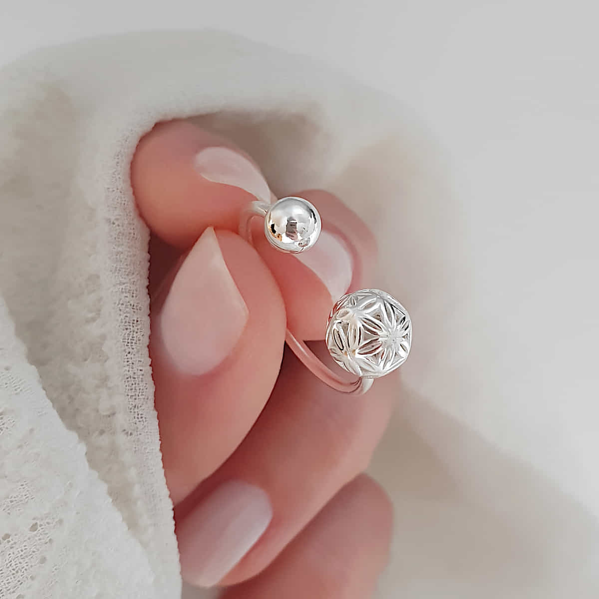 Entdecken Sie den offenen Damenring "Lebensblume Doppelkugeln" aus 925 Silber im floralen Schmuckdesign von Schoschon. Dieses filigrane Schmuckstück besticht durch seine kunstvoll gestaltete Blume des Lebens, eingearbeitet in eine der beiden dezenten Kugeln. Der Ring vereint symbolische Tiefe mit zeitloser Eleganz und eignet sich perfekt als besonderes Geschenk für Damen.