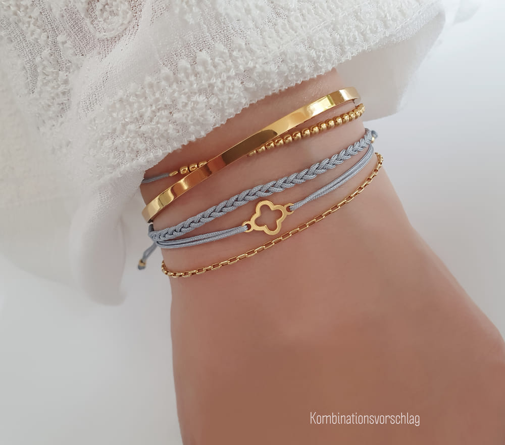 Zierliches Textilarmband in Grau mit einem Kleeblatt Symbol aus vergoldetem 925 Silber.