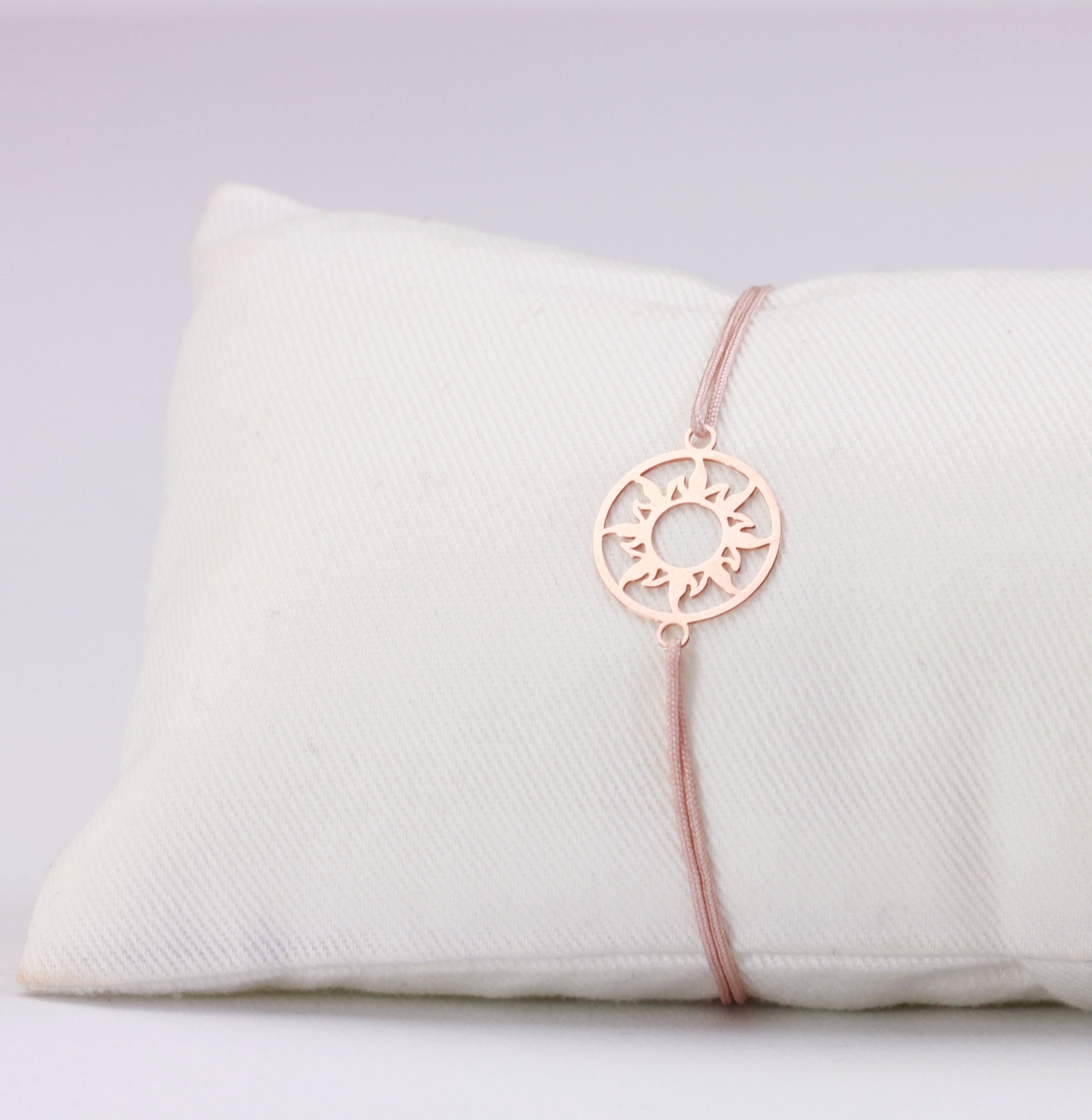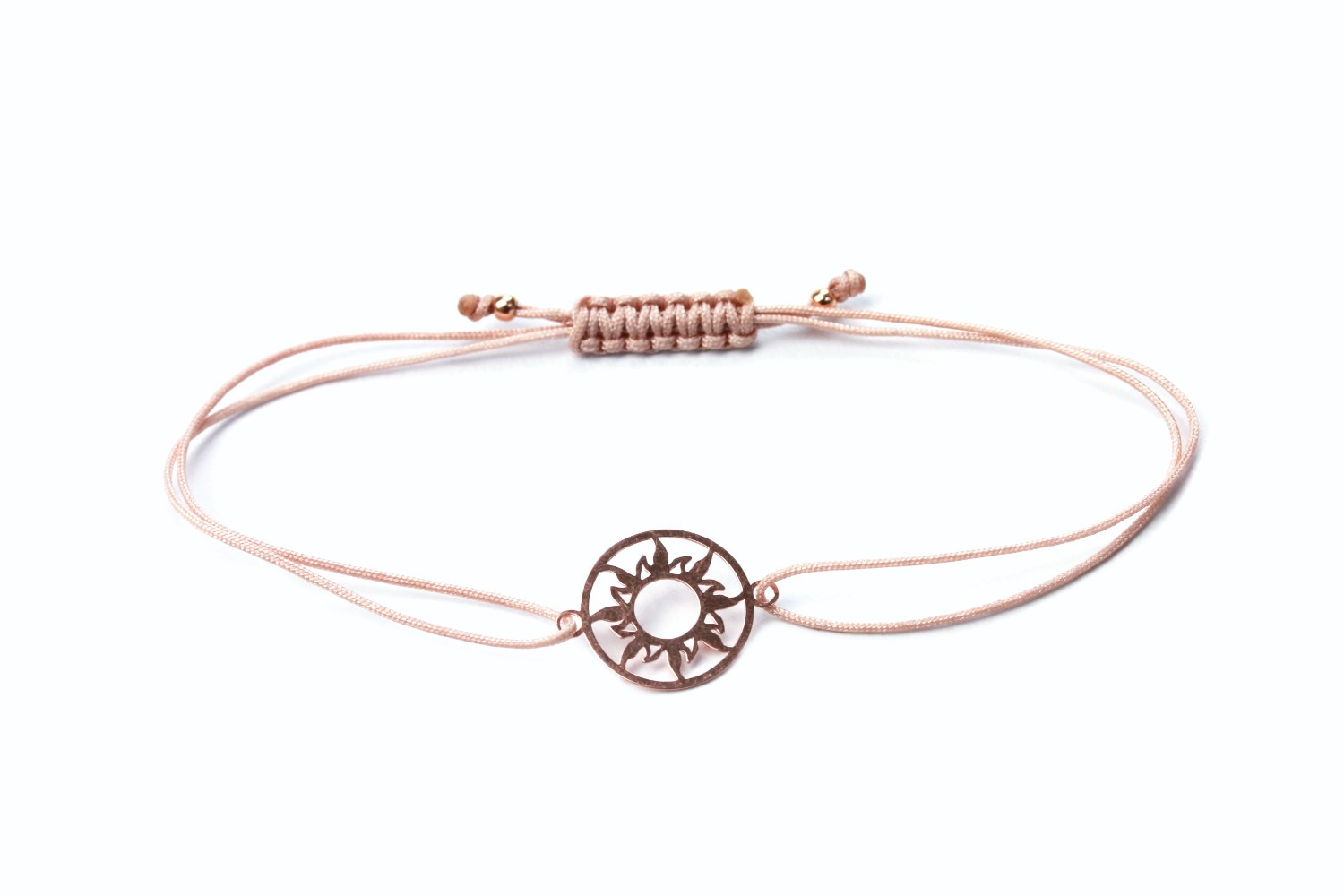 Zweireihiges Textilarmband in Nude setzt ein dezentes aber zugleich aufregendes Sonne-Symbol aus rosevergoldetem 925 Silber in Szene.