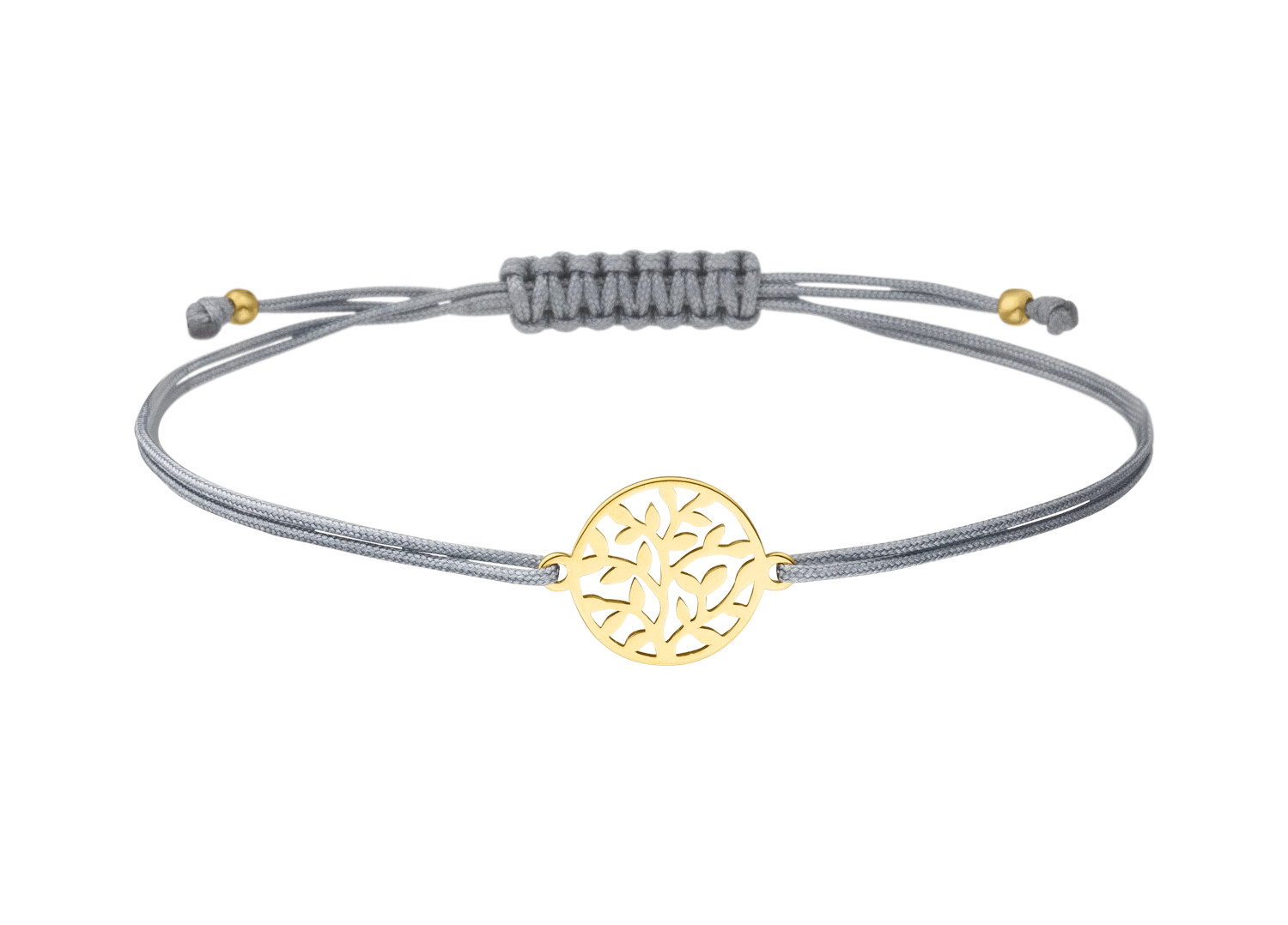 Graues Textilarmband mit einem 925 Silber vergoldeten Lebensbaum Symbol.