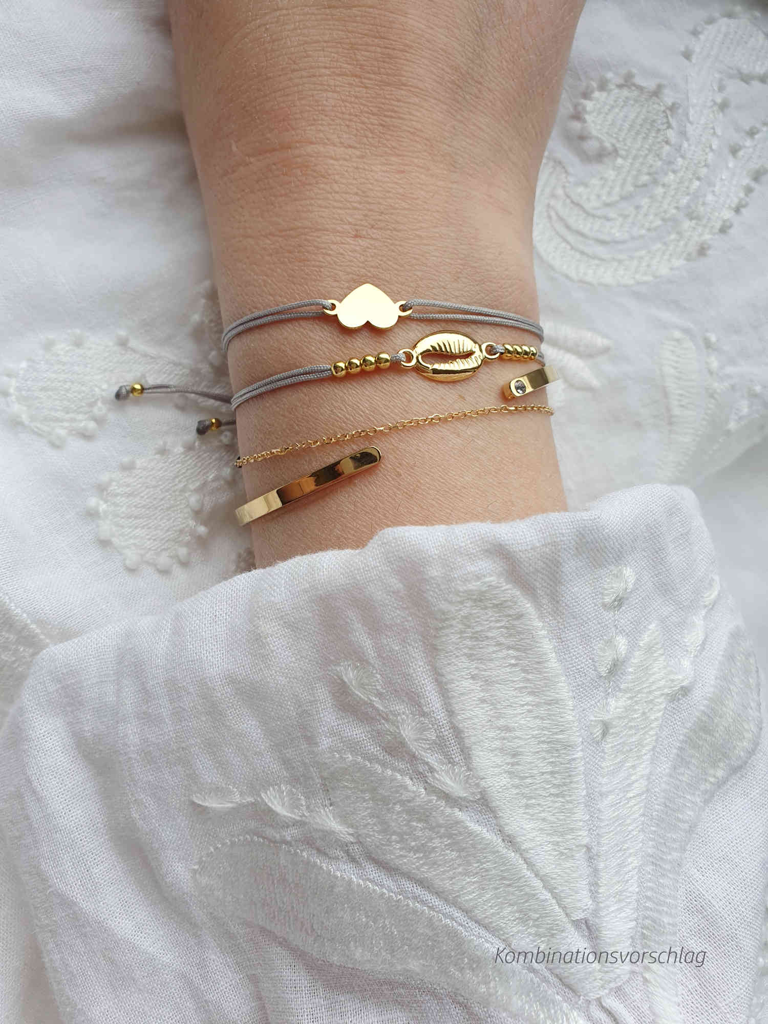 Das Muschelarmband hat als Verschluss einen Schiebeknoten und ist in der Länge verstellbar, so passt es für fast jedes Handgelenk.