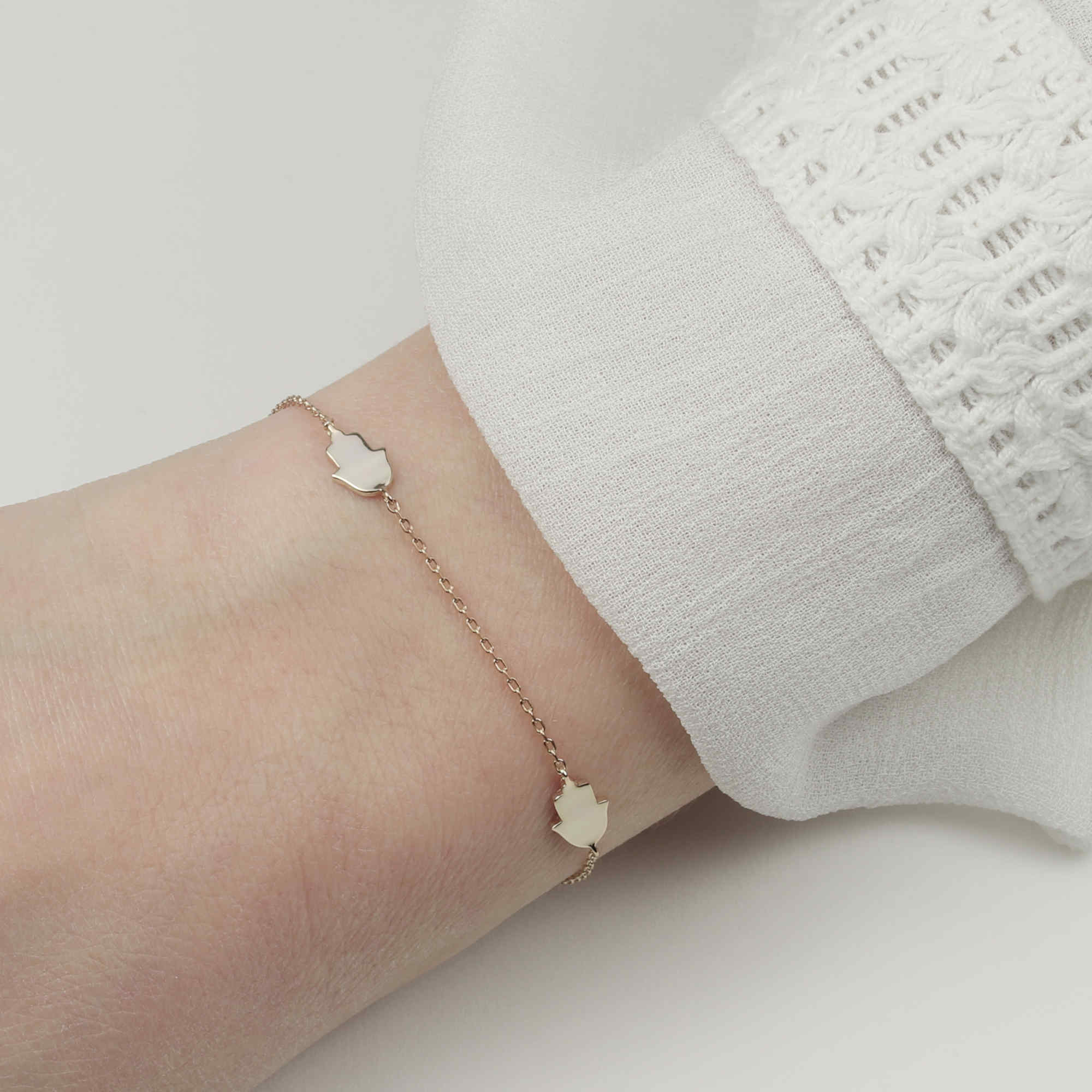 Eine zarte Silberarmkette mit 3 Fatimas Hand Symbole.